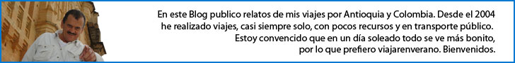 En este Blog publico relatos de mis viajes por Colombia y Antioquia. Desde el 2004 he realizado viajes, casi siempre solo, con pocos recursos y en transporte público. Estoy convencido que en un día soleado todo se ve más bonito, por lo que prefiero viajarenverano. Bienvenidos.